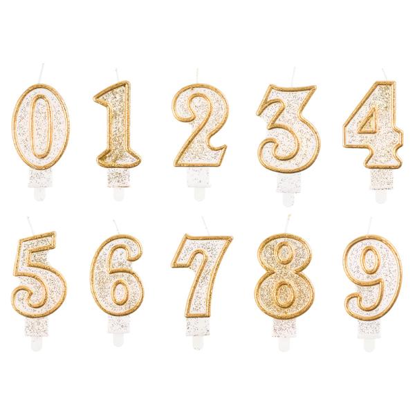 Tårtljus Siffra Glitter omfattar ett vitt tårtljus i form av en siffra med guldigt glitter. Tårtljuset är ca 6,5 cm stort och kommer med en liten hållare som håller den på plats på tårtan. Ljuset finns i sifforna 0-9.