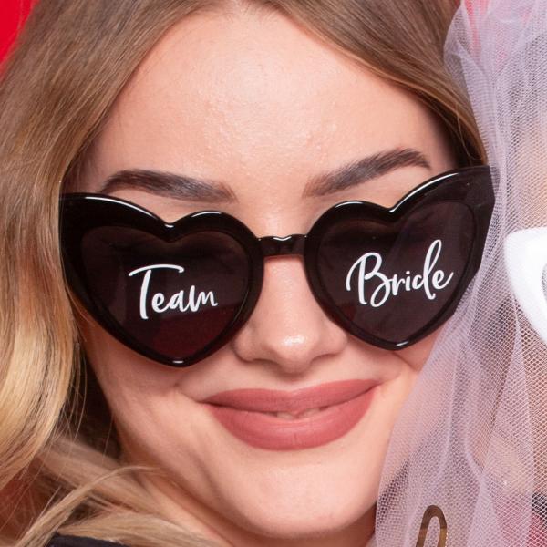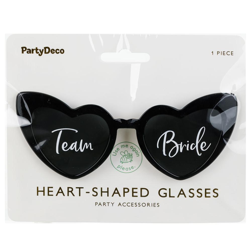 Team Bride Hjärtformade Glasögon omfattar ett par svarta, hjärtformade glasögon med mörktonade linser samt texten 'Team' och 'Bride' i vitt på respektive lins. Observera att glasögonen ej är UV-skyddade!