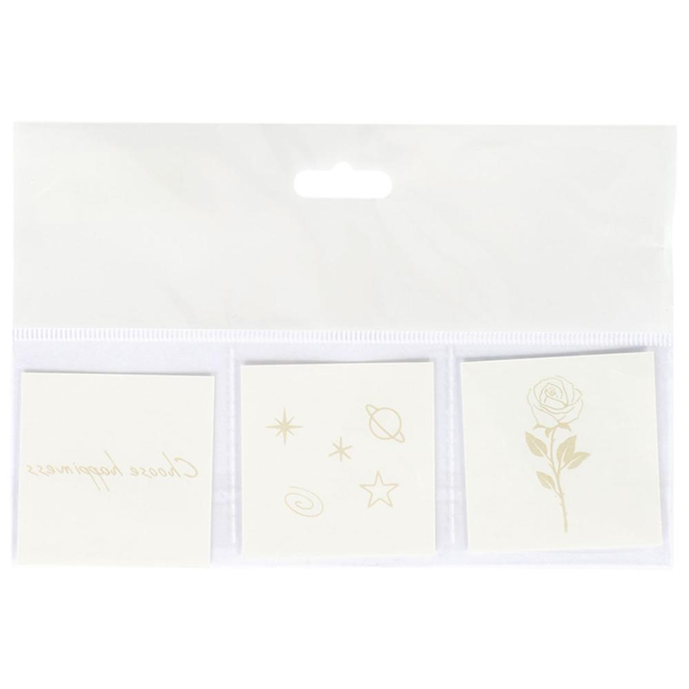 Temporära Tatueringar Happiness 3-pack innehåller tre olika temporära tatueringar med motiv av rymden, texten "Choose happiness" och en ros. De appliceras enkelt med vatten.