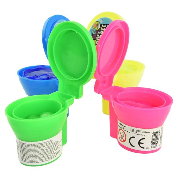 Toalett med Pruttslime Liten omfattar roligt pruttslime inuti en liten toalett i plast. När du stoppar ner fingrarna i slajmet uppstår ett pruttljud. Slime och toalett kommer i färgerna rosa, grönt, blått eller gult, vilken du får blir en överraskning.