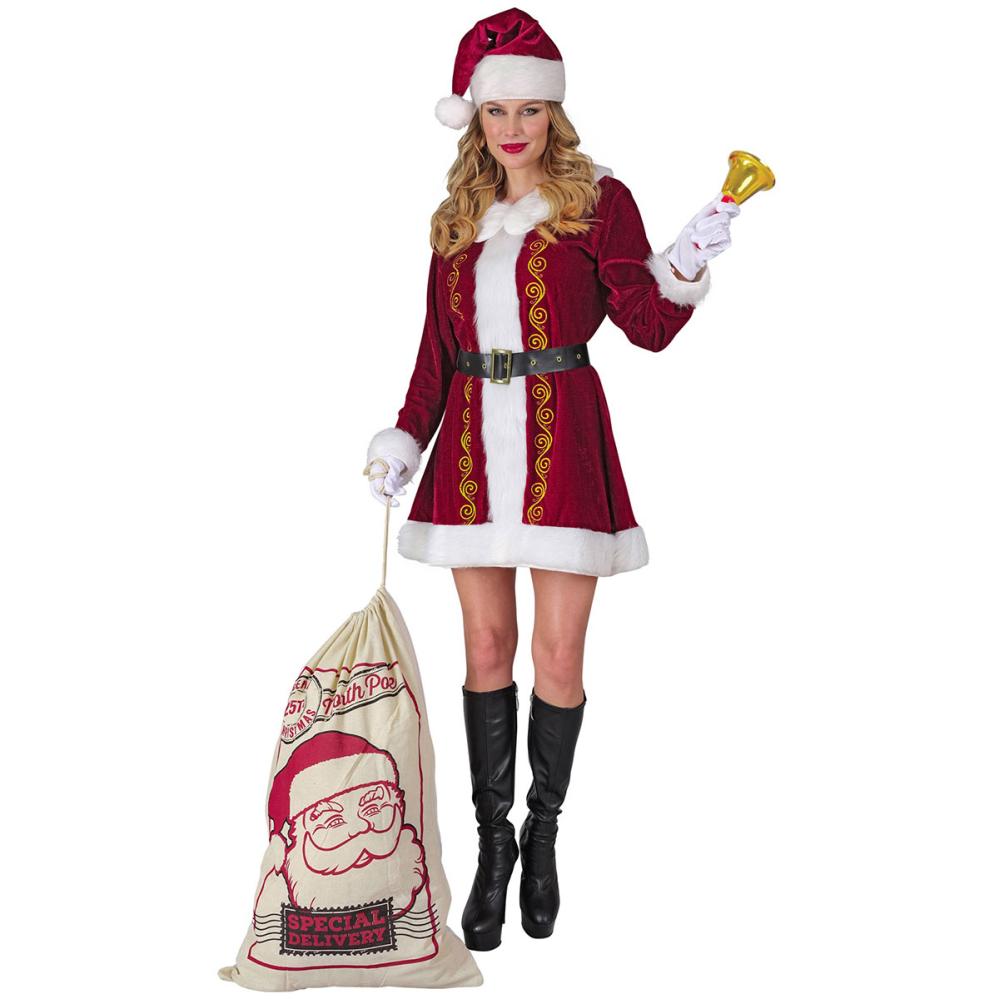 Tomtemor Juldräkt omfattar en kort klänning i mörkrött och vitt med krage och guldfärgade detaljer, ett svart midjebälte med guldspänne samt en tomteluva i mörkrött och vitt.