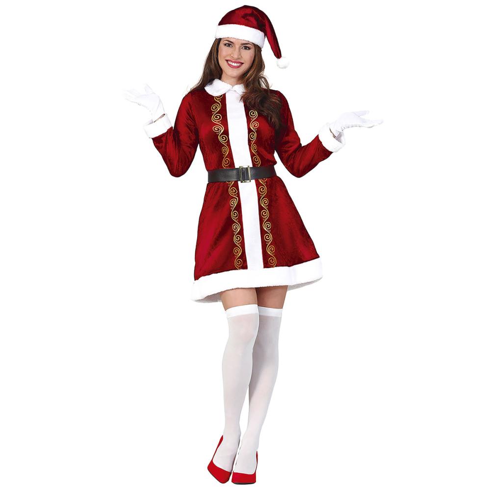 Tomtemor Juldräkt Mörkröd är en juldräkt i mörkrött och vitt. Dräkten innehåller en kort klänning med guldfärgade detaljer, ett svart midjebälte med guldspänne och en tomteluva.