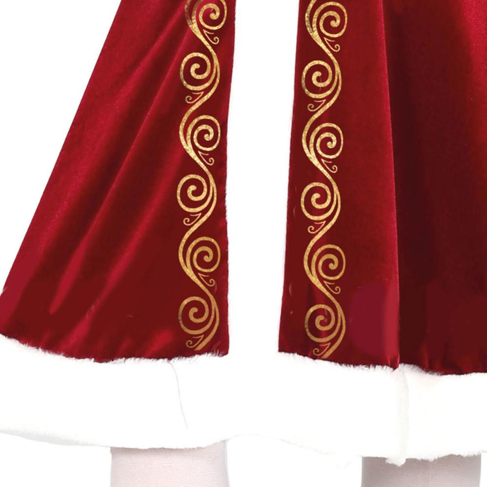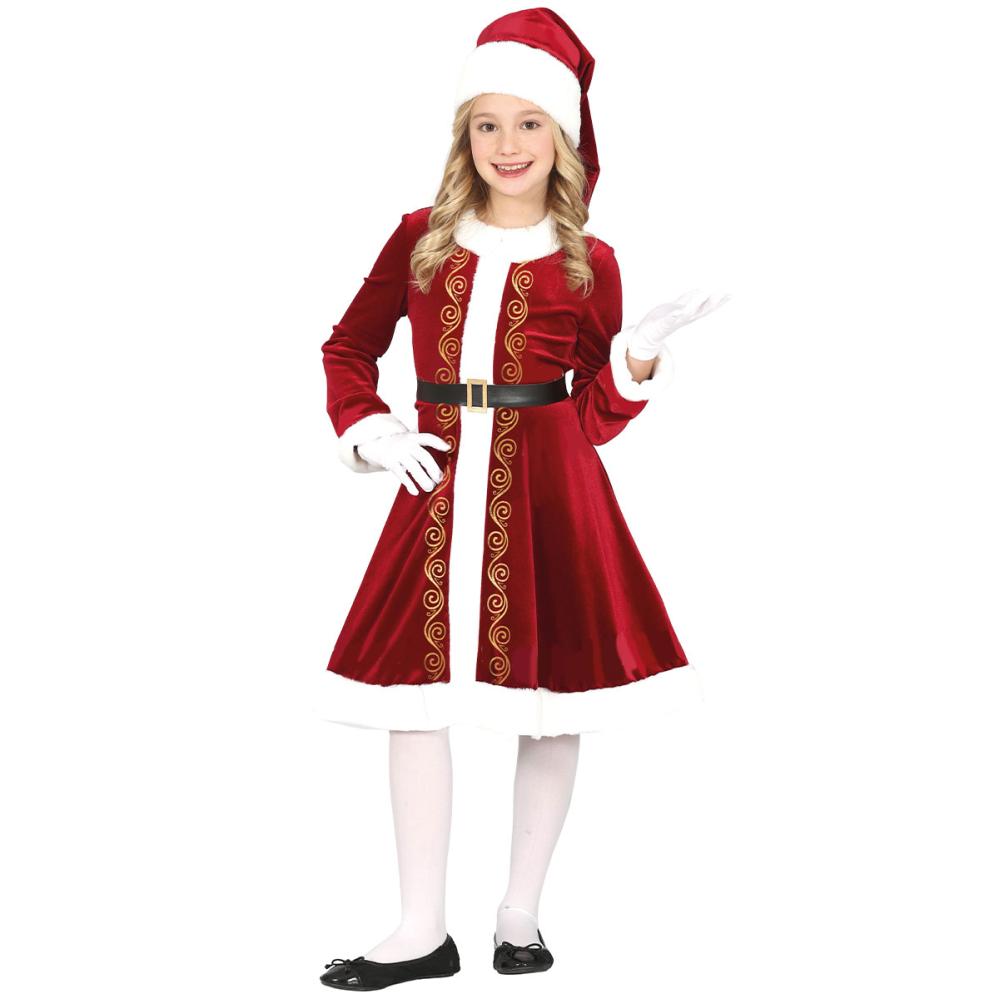 Tomtemor Juldräkt Mörkröd Barn är en barndräkt med julmotiv i mörkrött och vitt. Dräkten innehåller en kort klänning med guldfärgade detaljer, ett svart midjebälte med guldspänne och en tomteluva.