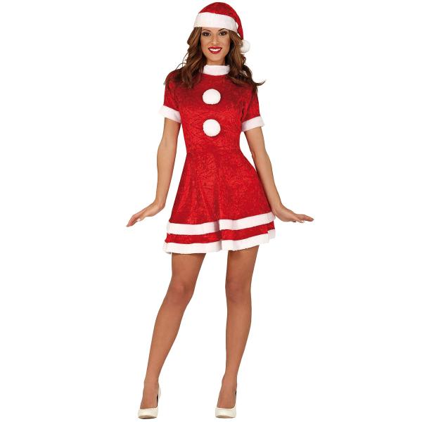 Tomtemor Julklänning med Tomteluva omfattar en röd och vit kort tomteklänning i plyschmaterial som är dekorerad med två vita bollar och har korta ärmar. Till dräkten medföljer även en matchande tomteluva.
