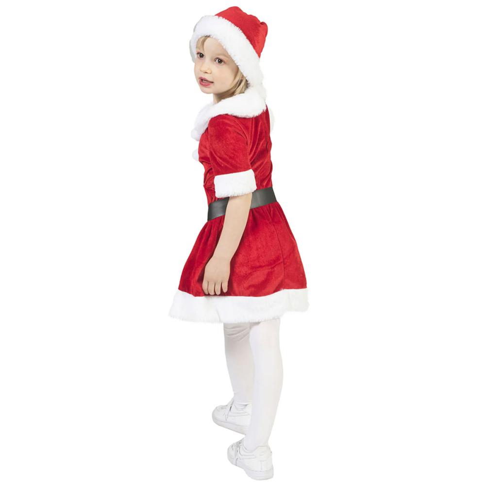 Tomtenisse Dräkt Röd Barn innehåller en tomteluva, ett svart bälte och en kort klänning i rött och vitt med vit krage, tre vita bollar framtill och vit nederkant.