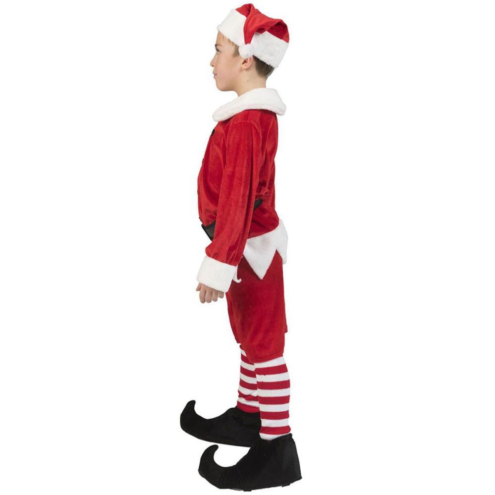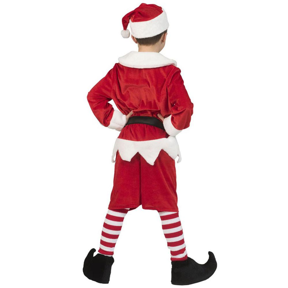 Tomtenisse Juldräkt Röd Barn omfattar en tomtenissedräkt i rött och vitt med en tomteluva, ett par shorts, ett svart bälte och en jacka med vit krage, svarta knappar framtill och taggiga vita kanter.