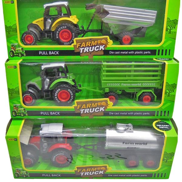Traktor Set Metall omfattar en detaljerad traktor i formgjuten metall och plast samt ett släp. Finns i färgerna gul eller röd, vilken du får blir en överraskning.