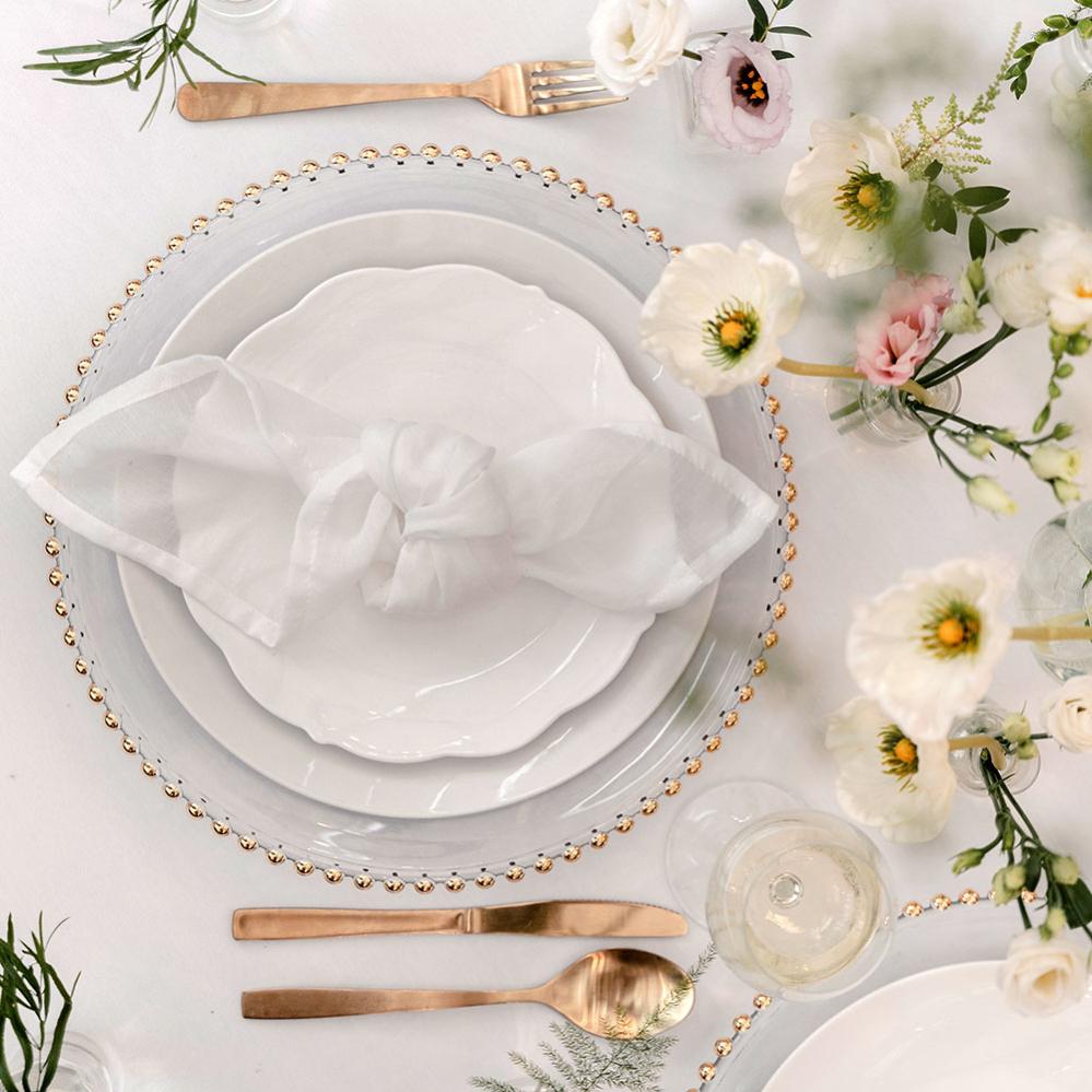 Låt våra vita tygservetter vara pricken över i:et på din bröllopsdukning. Detta 4-pack av lyxiga servetter är det perfekta bröllopstillbehöret för att skapa en elegant och stilfull atmosfär. Tillverkade av högkvalitativ bomull och polyester, är dessa servetter både hållbara och mjuka att använda. Duka upp din bröllopsfest med stil och låt våra vita tygservetter sätta tonen för en minnesvärd dag.
