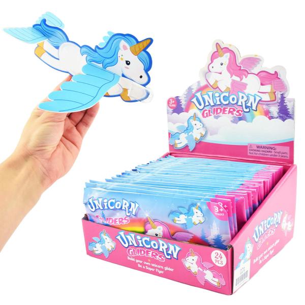 Unicorn Gliders Glidflygplan omfattar ett glidflygplan som ser ut som en flygande enhörning med vingar som glider fram genom luften när du kastar den. Leksaksflygplanet är ca 20 cm långt, är tillverkad i skumplast och monteras enkelt ihop. Enhörningen är vit med antingen rosa eller blå detaljer, vilken du får blir en överraskning.