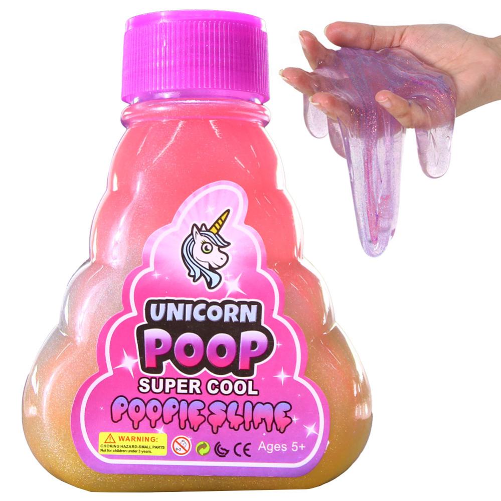 Unicorn Poop Slime består av ett glittrigt, flerfärgat slime i en söt plastförpackning med lila kork.