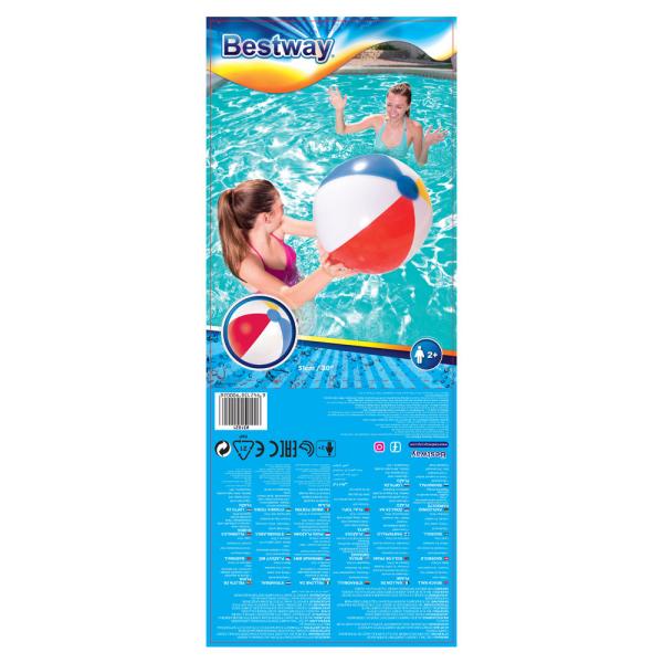 Uppblåsbar Badboll Randig omfattar en uppblåsbar randig badboll i rött, gult, blått och vitt. Badbollen har säkerhetsventil, är tillverkad i kraftig vinyl och är ca 51 cm stor när den är uppblåst. Passar barn från 2 år.