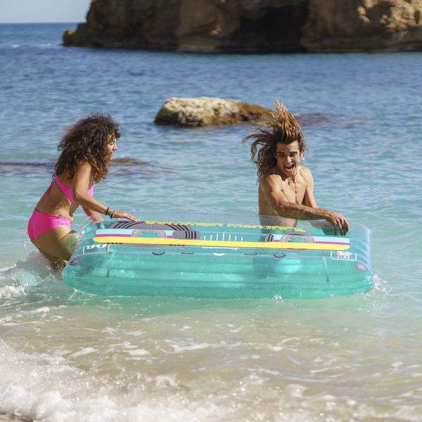 Unna dig själv en upplevelse utöver det vanliga med vår Uppblåsbara Badmadrass Kassettband med Högtalarutrymme! Denna turkosa uppblåsbara flytmadrass kommer garanterat att bli huvudattraktionen vid nästa poolparty. Med sin retro kassetbanddesign och förvaringsutrymme för en Bluetooth-högtalare är den perfekt för alla musikälskare. Perfekt för en härlig dag på sjön eller i poolen, det bästa av uppblåsbara pooltillbehör. Så dra på dig badshortsen och slappna av i stil på denna uppblåsbara badmadrass!