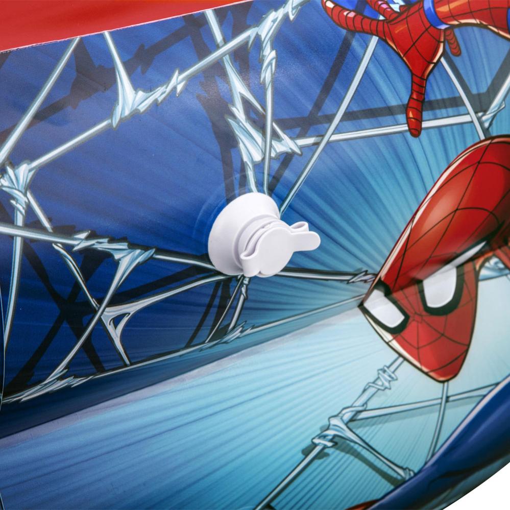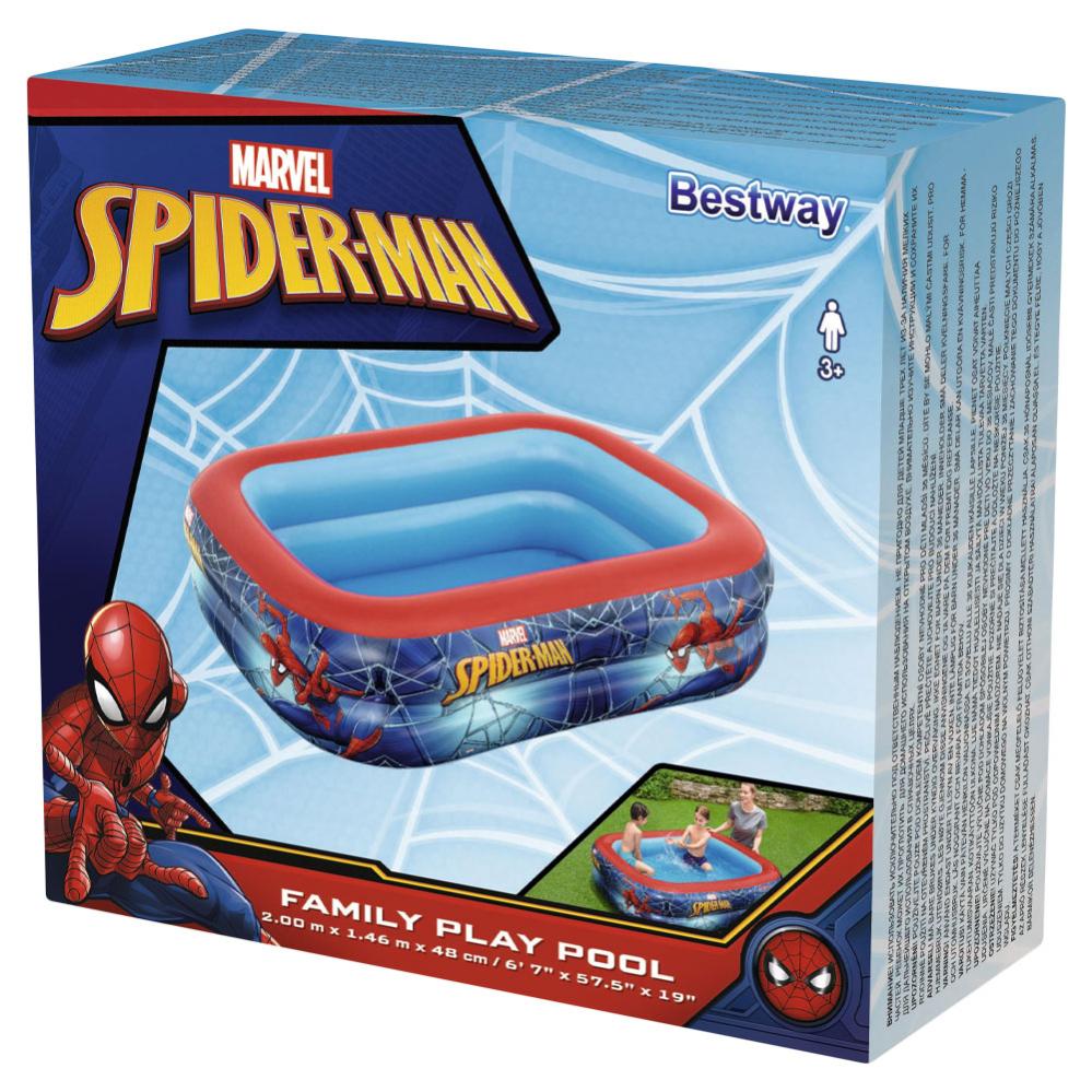 Uppblåsbar Barnpool Spiderman omfattar en uppblåsbar barnpool med Spiderman motiv i rött, blått och gult. Poolen är ca 2 meter lång och 1,46 meter bred och har extra breda väggar på 48 cm. Spiderman pool har en vattenkapacitet på 450 liter och är tillverkad i PVC plast. Lagningslapp medföljer.