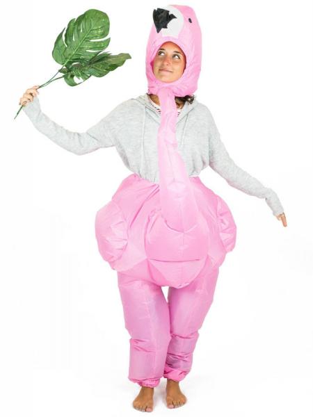 Uppblåsbar Flamingodräkt innehåller en uppblåsbar flamingo maskeraddräkt i rosa som du bär som ett par byxor. Dräkten har även en lång hals med flamingo-huvud som du enkelt kan fästa runt ditt eget huvud.