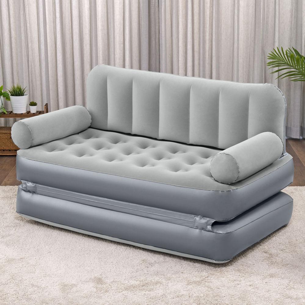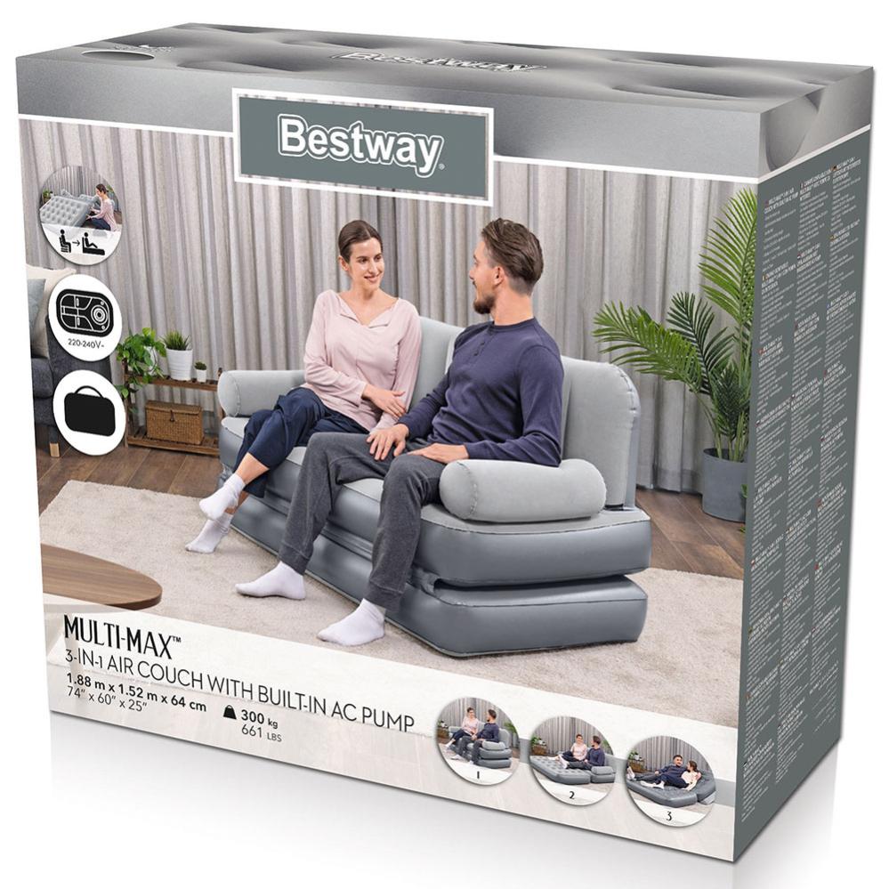 Uppblåsbar Soffa 3?In?1 Inbyggd Luftpump Multi?Max är en grå uppblåsbar soffa med en flerfunktionell design som kan användas som soffa eller dubbelsäng. Den har en bekväm fällbar design, perfekt för inomhusbruk och har en inbyggd 220-240V elektrisk luftpump som blåser upp soffan på ca 3-4 minuter.