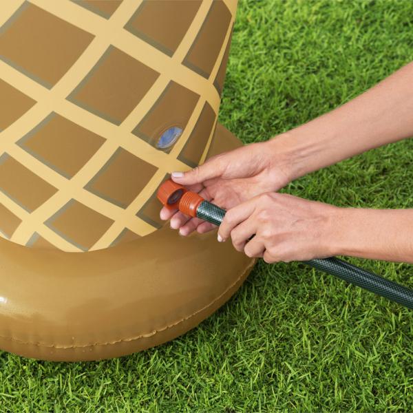 Skoja loss i trädgården med en uppblåsbar glass med vattensprinkler, en superkul vattenleksak för leksugna barn en varm sommardag. Med denna härliga glass och vattenspridare kommer också ett roligt ringkastningsspel, perfekt uppblåsbar badleksak som garanterat bjuder på rolig barn lek.