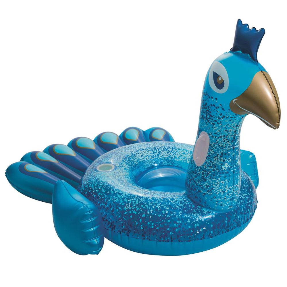Uppblåsbart Baddjur Påfågel omfattar ett uppblåsbart baddjur i form av en blå påfågel med två handtag på halsen och en mugghållare. En lagningslapp medföljer.