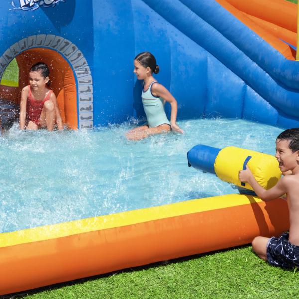 Superkul uppblåsbart vattenland och lekpool full av spännande grejer som vattenkanoner, dubbelsidig rutschkana, klättervägg och skojigt basketspel. Detta vattenlekland är perfekt i sommarvärmen och passar bad och leksugna barn, perfekt vattenlekplats för alla barn som vill göra äventyrliga vattenlekar.