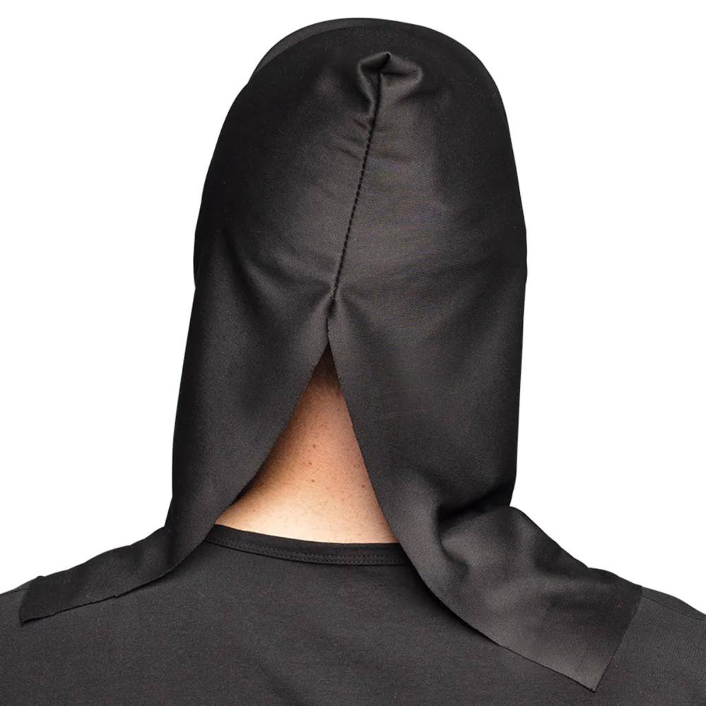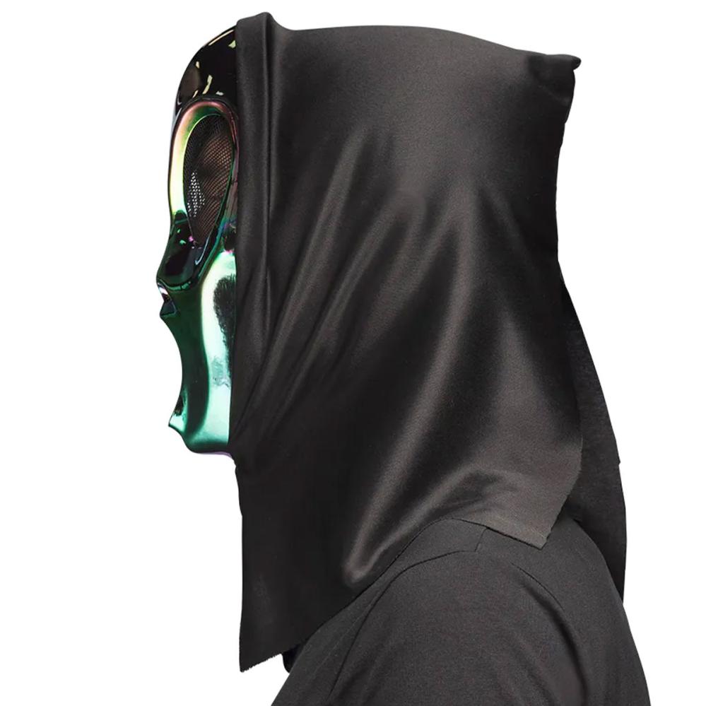 Utomjording Mask Iriserande Svart omfattar en spegelblank iriserande svart mask som skiftar i mörka färger och föreställer en utomjording. Masken har hål för ögon, näsa och mun samt en svart tygbaksida.