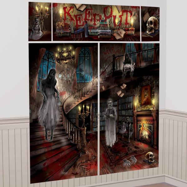 Väggdekoration Spökhus omfattar en stor väggdekoration av plastmaterial i 5 olika delar. Väggdekorationen avbildar hallen till ett viktorianskt hus fullt av saliga andar och kusliga detaljer såsom blodstänk som läser "Keep out". Passar även för utomhusbruk. Fästs med eget val av klister eller tejp.