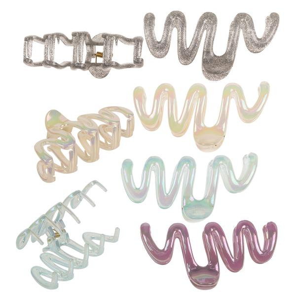 Vågig Hårklämma 10,5 x 5 cm består av en vågformad hårklämma i en skimrande, ljus nyans. Klämman finns i fyra olika färger.