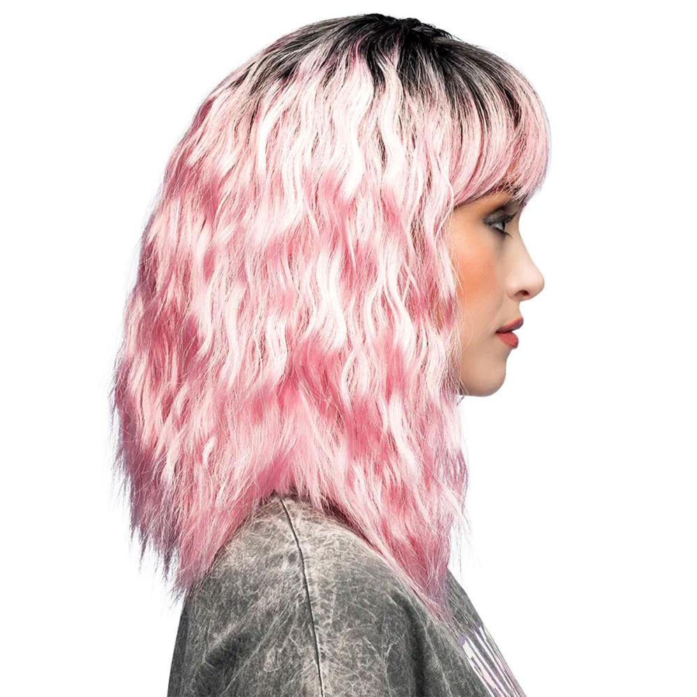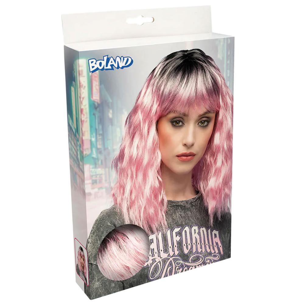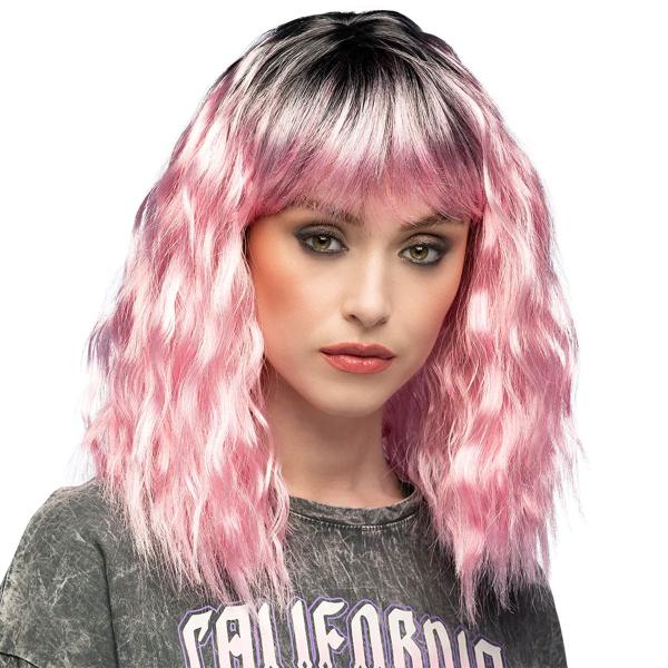Vågig Peruk Rosa/Svart omfattar en axellång peruk med vågigt hår och lugg i rosa och svart.