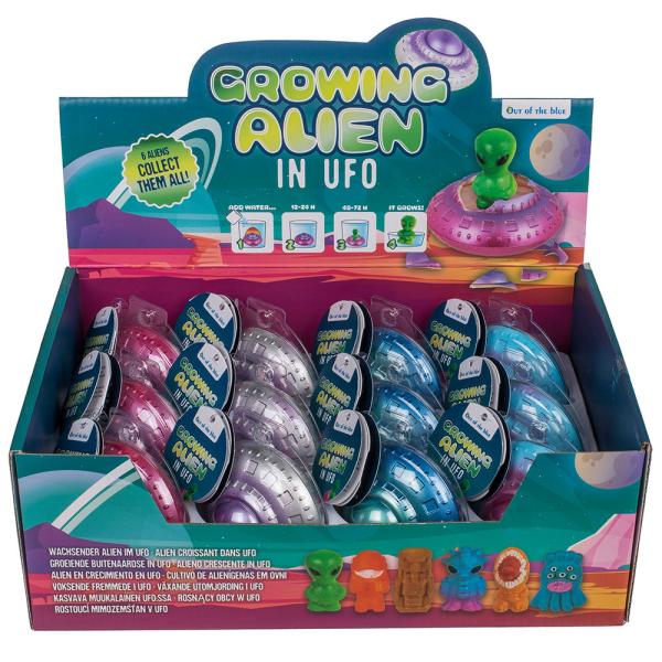 Växande Alien i UFO omfattar ett plast UFO som innehåller en liten alien som växer sig stor av vatten. Lägg skeppet i vatten och se den växa sig stor under ca 72h. Finns i fyra olika färger, vilken du får blir en överraskning.