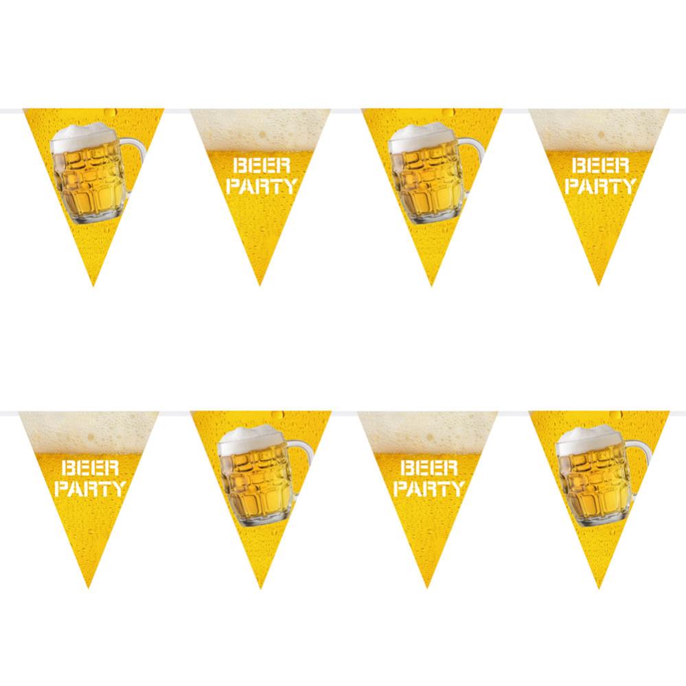 Vimpelgirlang Beer Party omfattar 10st flaggvimplar med orden "Beer Party" på och gul ölliknande färg med bubblor.