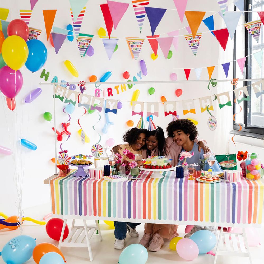 Förhöj stämningen med en färgsprakande flaggirlang i 6 meters längd. Perfekt som hängande dekoration på kalas, med plats för tio färgglada flaggor. Smidig att packa ihop och återanvända bland dina bästa kalasdekorationer.