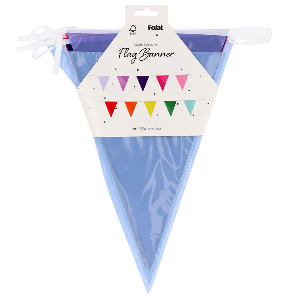 Vimpelgirlang Flerfärgad 6 m är en girlang med tio vimpelflaggor i olika färger. Det finns 11 cm utrymme mellan flaggorna och 1,5 meter utrymme i vardera änden för upphängning. Den sista flaggan fungerar också som en påse där de andra flaggorna kan förvaras.
