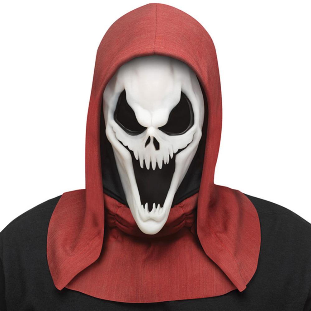 Viper Ghostface Mask Dead by Daylight omfattar en vit ghostface mask med svarta ögon och mun i mjuk gummi med en röd huva och ett resårband.