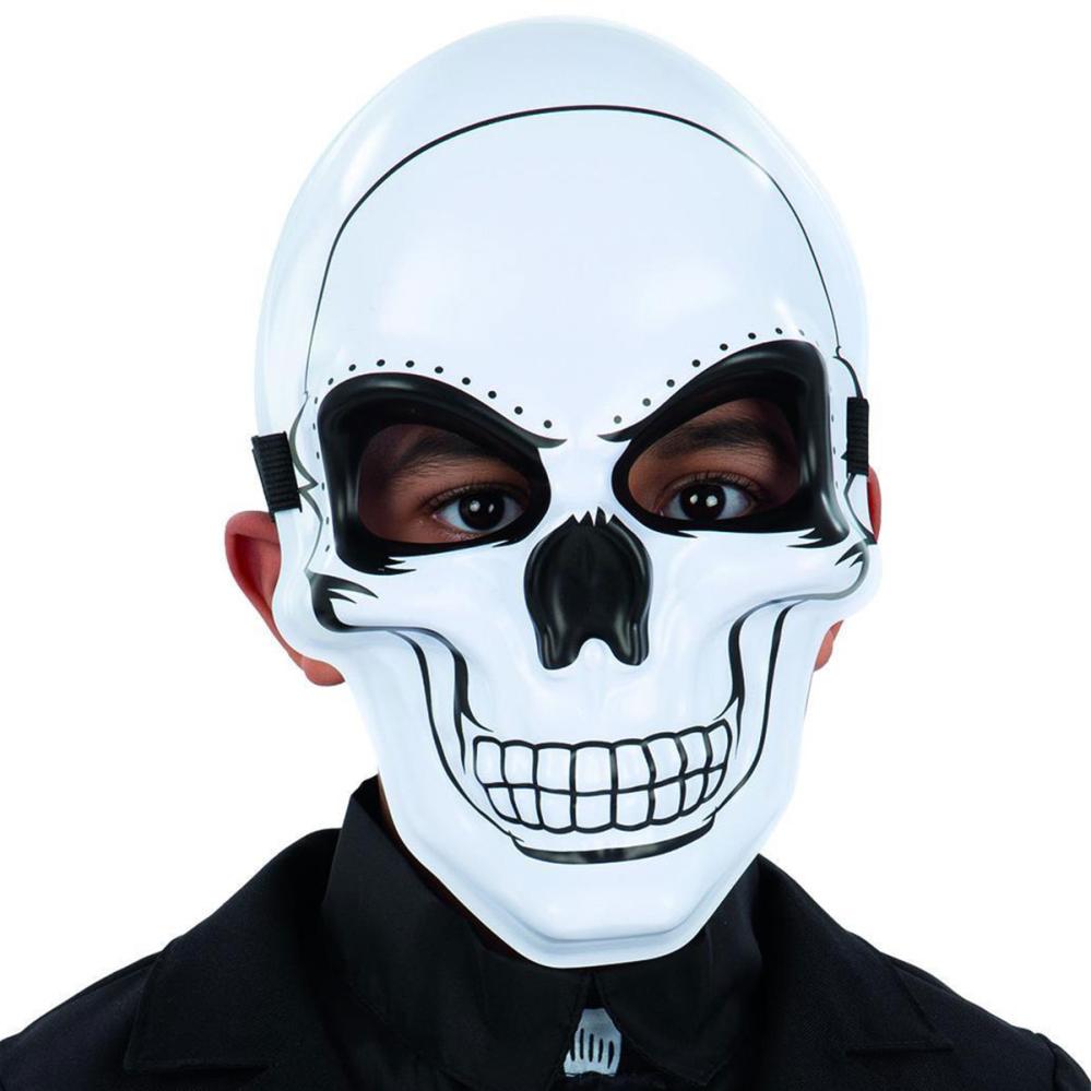 Vit Dödskallemask Barn omfattar en vit mask i form av en dödskalle med svarta konturer och hål för ögon, näsa och mun. Masken täcker framsidan av ansiktet och hålls på plats med hjälp av ett svart elastiskt band. Den har även en vit vaddering som vilar mot pannan, vilket skapar en bättre passform samt gör den bekvämare att bära under en längre tid.