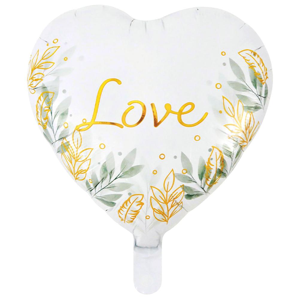 Fira Alla hjärtans dag med en stilren hjärtformad ballong. Denna vita hjärtballong pryds av eleganta växtmotiv och ballongen har dessutom den skimrande guldtexten "Love", vilket skapar ett romantiskt och stilrent intryck.
