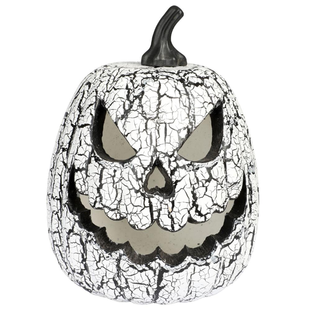Vit Halloweenpumpa med LED-ljus omfattar en vit pumpadekoration med sprucken ytdesign, klassiskt Halloween-ansikte och en liten svart stjälk. Inuti finns en LED-lampa som lyser upp pumpan och på undersidan sitter en praktisk On/Off-knapp.