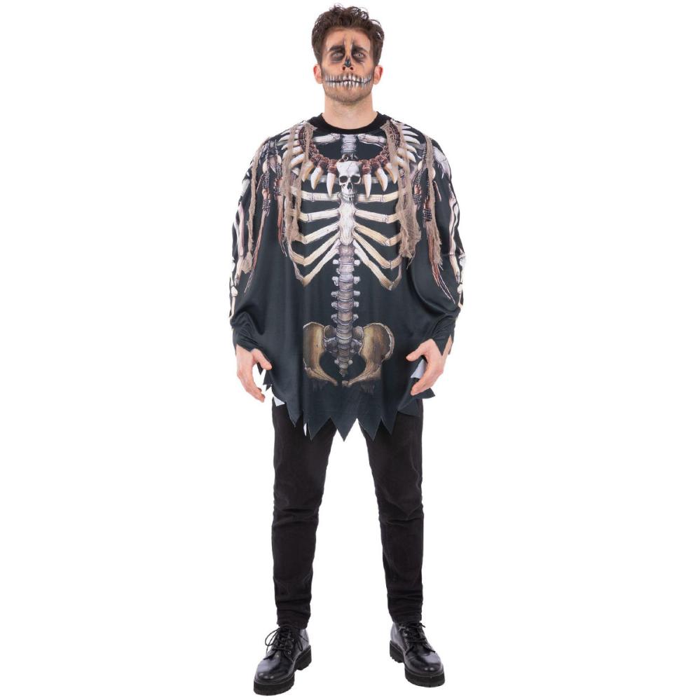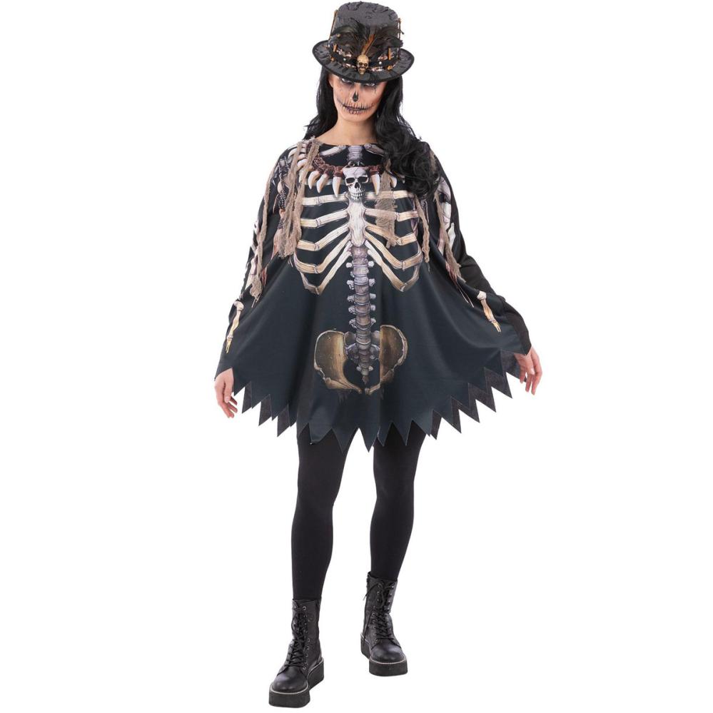 Ge din voodoo-maskeraddräkt en extra dos mystik med denna Halloween-poncho. En perfekt svart poncho med skelettmotiv och voodoo-smycken som sätter tonen för en kusligt minnesvärd kväll.