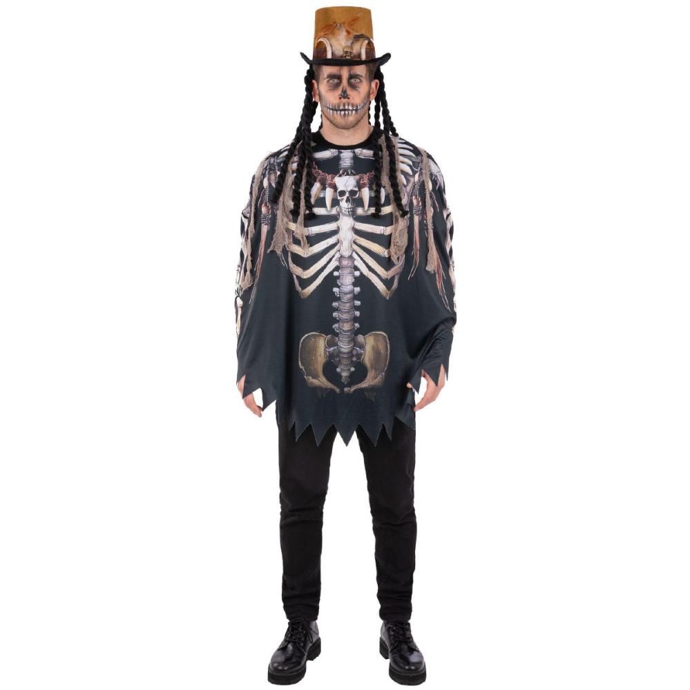 Voodoo Häxdoktor Poncho omfattar en svart poncho med taggig nederkant, med motiv av ett vitt skelett samt diverse voodoo-smycken.
