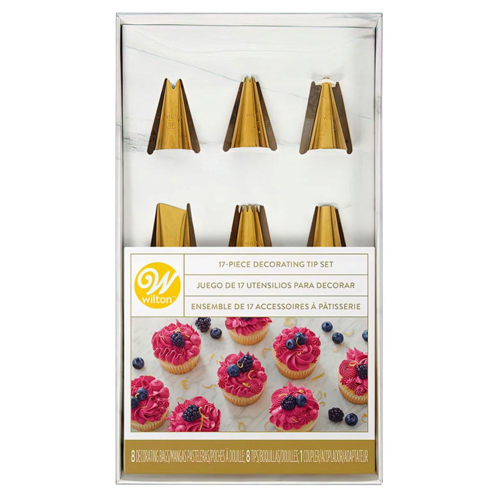 Nöj dig inte med något annat än Wilton Decorating Tip Set spritstyllar i rostfri stål med pläterad guld! Wilton sprits-tyllset i guld ger dina tårtor och cupcakes den där extra skjutsen till att se fantastiskt vackra ut så sätt igång och dekorera nu.