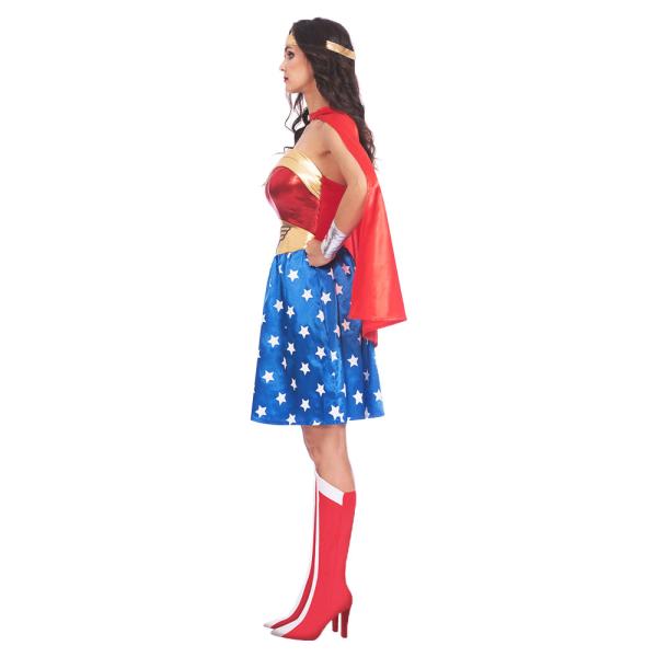 Wonder Woman är en populär hjältinna som dessutom har riktigt snygga kläder, och med denna fina dräkt kan även du klä upp dig i hennes tjusiga kostym! Supersnygg Wonder Woman maskerad utklädnad med flera olika delar som gör dig redo för festen på ett ögonblick. Komplettera gärna med passande vapen för en fulländad och riktigt snygg look!