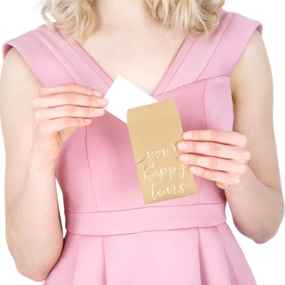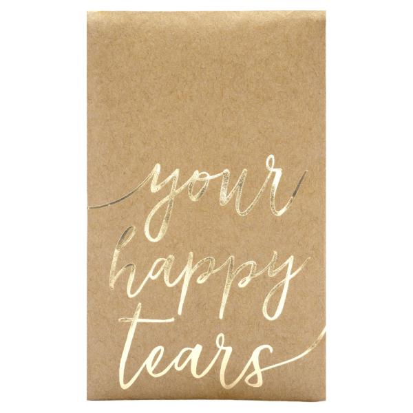 Under en bröllopsceremoni är det inte många ögon som håller sig torra, så se till att förbereda inför många glädjetårtar med dessa fina pappersnäsdukar. Praktiska näsdukar i fina pappförpackningar med texten "Your Happy Tears" på framsidan, vilket passar perfekt till varje bröllop. Riktigt fina happy tears näsdukar som garanterat kommer att komma till användning under ceremonin.